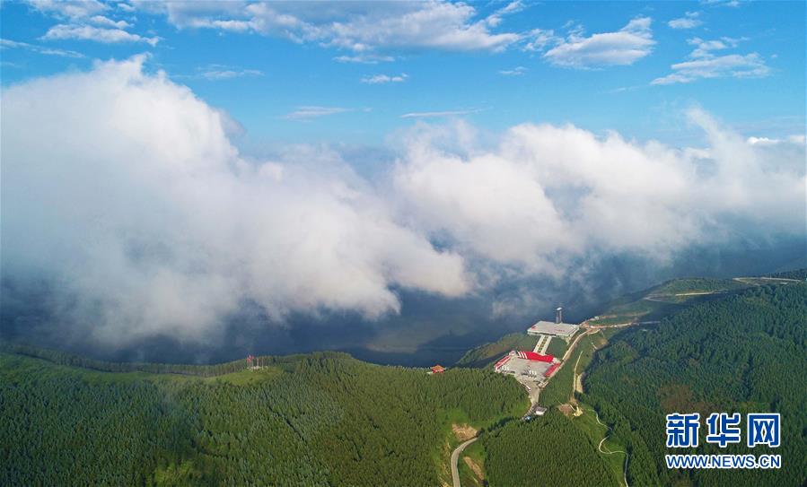 位于宁夏固原市隆德县境内的六盘山红军长征纪念亭在云海与绿林中格外醒目(2018年8月29日摄,无人机照片)。新华社记者王鹏摄