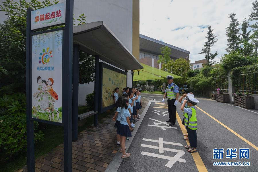6月9日,交警在校园“交通安全模拟公路”的模拟公交车站给孩子们讲解等车时的安全注意事项。 当日,浙江省新昌县公安局交警大队民警在新昌幼儿园举行“小手拉大手 文明出行进校园”活动,通过道路模拟出行、公交站模拟等车、学做小交警、考取“幼儿园模拟驾驶证”等活动,对师生开展交通安全培训,倡导大家文明安全出行。 新华社记者 徐昱 摄