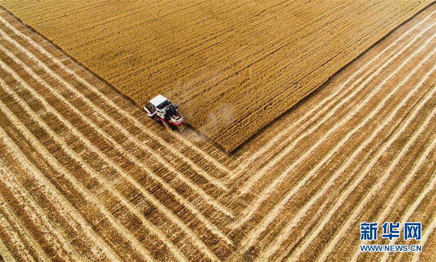 6月10日,在河北省武安市大同镇马会村,农机手操作机械设备收割小麦(无人机照片)。 “三夏”时节,华北平原麦田满目金黄,麦收工作进入高峰期。农民抓住天气晴好的有利时机抢收小麦,确保颗粒归仓。 新华社记者 王晓 摄