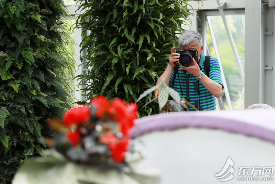 一位市民带着专业设备来到温室拍摄秋海棠。