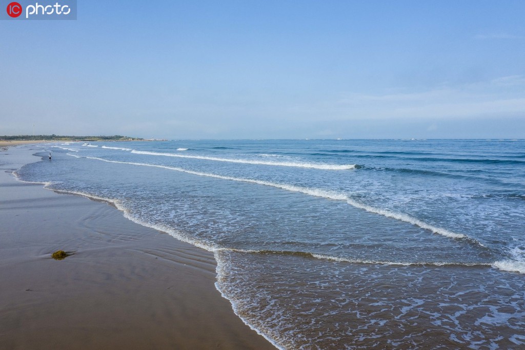 2020年6月10日,山东青岛西海岸新区银沙滩空明澄碧,蔚蓝的海上海浪翻卷,游人戏浪。海浪急切地奔向海岸,亲吻金色的海滩。