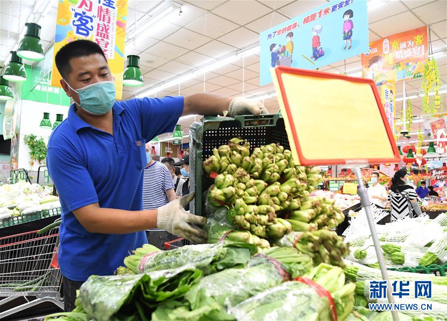 6月15日,在北京市朝阳区的京客隆甜水园店,工作人员在搬运蔬菜。 近日,位于北京市朝阳区的京客隆甜水园店在做好新冠肺炎疫情防控工作的前提下,加大农产品备货量,保障市场供应。 据了解,京客隆甜水园店的所有蔬菜、水果均来自京客隆集团自有配送中心的果蔬直采基地,其中蔬菜主要来自河北、山东等多个直供产地。目前京客隆甜水园店每日蔬菜供应量约为平日的8倍左右,鲜肉供应量约为平日的4倍左右。 新华社记者 任超 摄