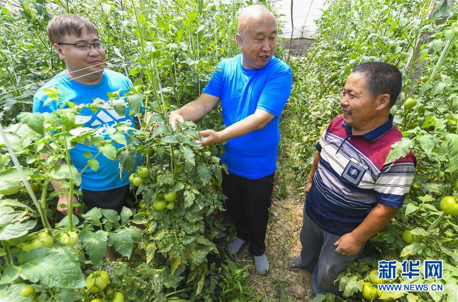 6月14日,县乡结对帮扶干部到刘峰(右)的西红柿大棚内帮助查看西红柿的长势。 今年50岁的刘峰曾是河北廊坊市永清县龙虎庄乡义井村的贫困户,因自己和妻子身体不便不能外出打工。得益于精准扶贫政策的实施,2018年以来,在当地县乡村三级帮扶及爱心企业的协助下,刘峰在温室大棚种植西红柿。经过夫妻辛勤耕耘,大棚西红柿年收入达3万余元。 新华社记者 李晓果 摄