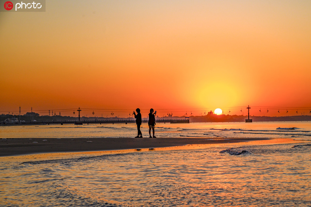 2020年6月15日,河北省,秦皇岛市北戴河晴空万里,空气新鲜。清晨,一轮金色太阳,从海上喷薄而出,景观十分壮美。众游客前来观赏拍照!