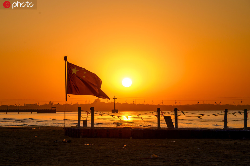 2020年6月15日,河北省,秦皇岛市北戴河晴空万里,空气新鲜。清晨,一轮金色太阳,从海上喷薄而出,景观十分壮美。众游客前来观赏拍照!