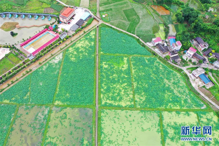 这是6月13日拍摄的思南县塘头镇荷田风光(无人机照片)。 6月以来,贵州省思南县塘头镇1200亩荷田里的荷花渐次开放,景色优美。 新华社记者 刘勤兵 摄