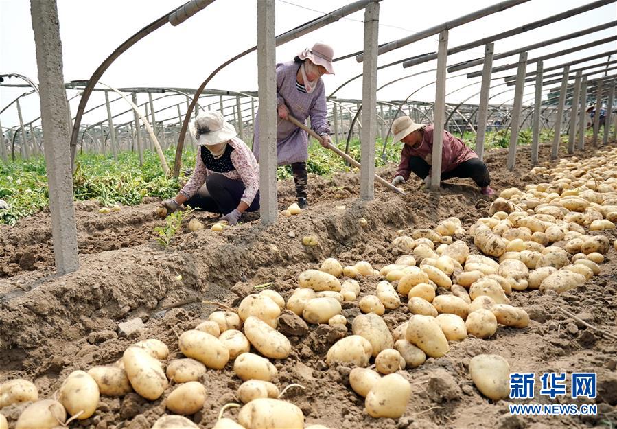 6月13日,昌黎县新集镇裴各庄二村的农民在田间收获马铃薯。新华社记者 杨世尧 摄