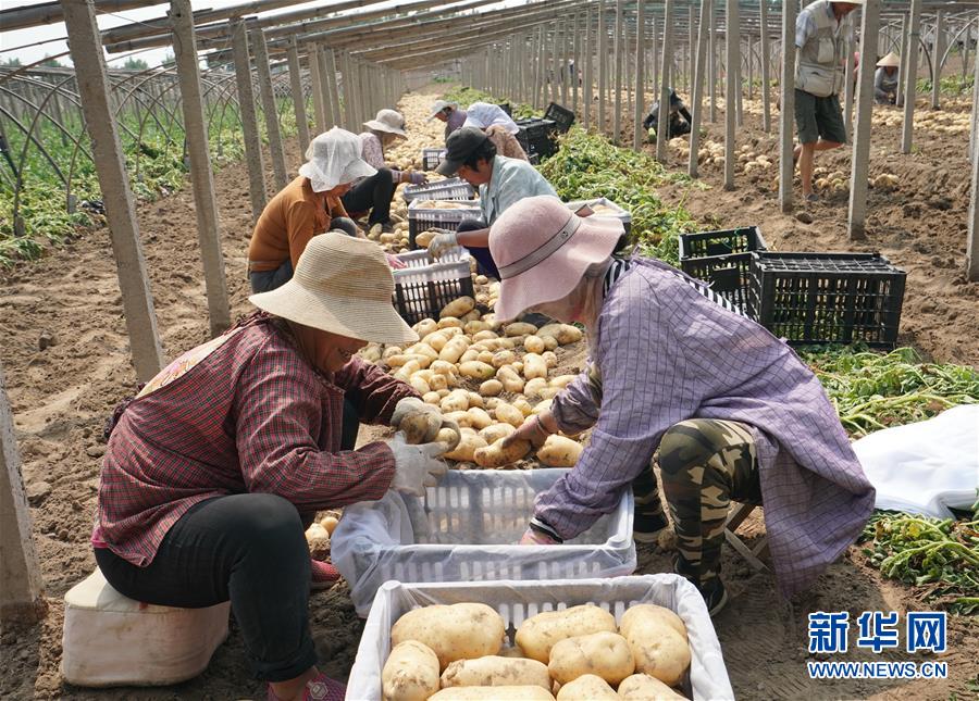 6月13日,昌黎县新集镇裴各庄二村的农民将收获的马铃薯装筐。新华社记者 杨世尧 摄
