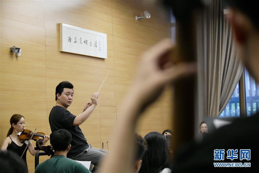 6月17日,杭州爱乐乐团驻团指挥洪音在排练厅指挥西安交响乐团彩排。新华社记者 李一博 摄