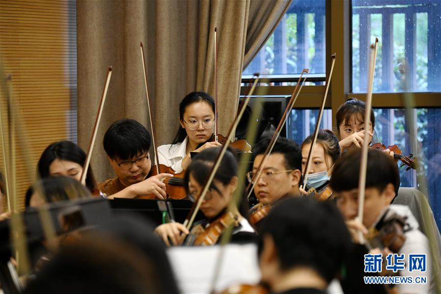 6月17日,西安交响乐团的提琴乐手们在排练厅彩排。新华社记者 李一博 摄