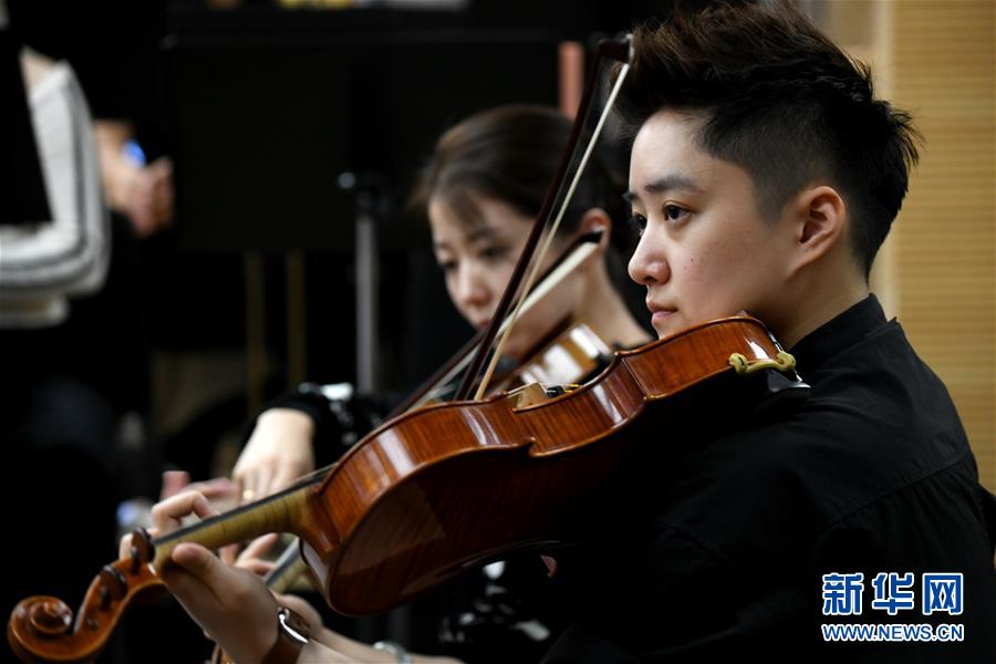 6月17日,西安交响乐团中提琴演奏员庄燊(前)在排练厅彩排。新华社记者 李一博 摄