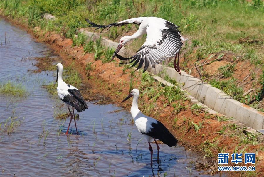 6月17日,三只东方白鹳从笼中飞出。 新华社记者 周密 摄