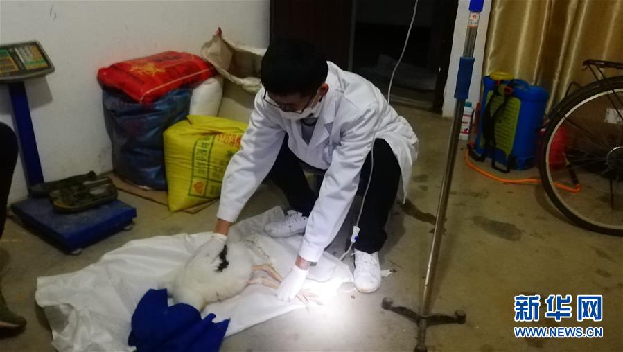 救治中心工作人员在照顾东方白鹳雏鸟(4月1日摄)。 新华社发(况绍祥摄)