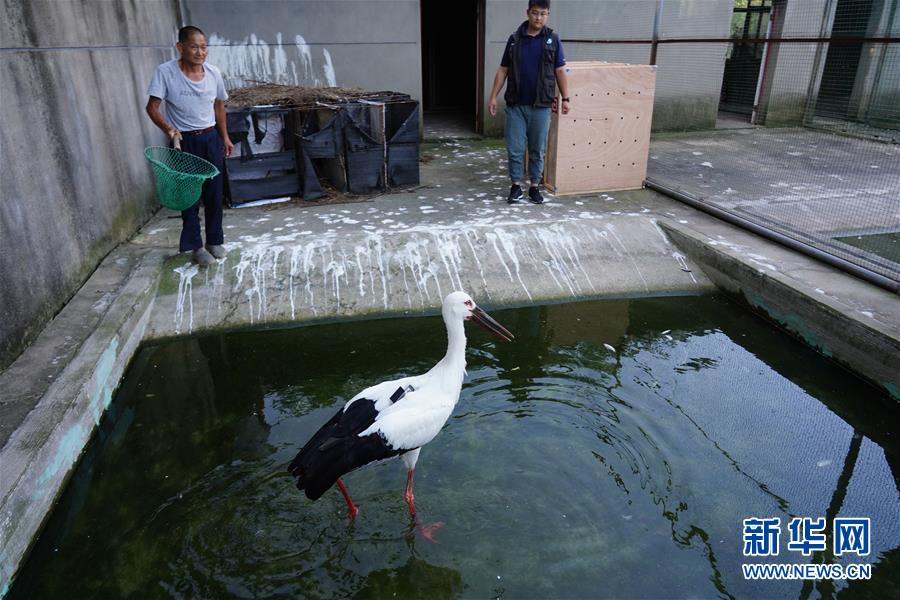 6月17日,工作人员准备将三只东方白鹳装箱。 新华社记者 周密 摄