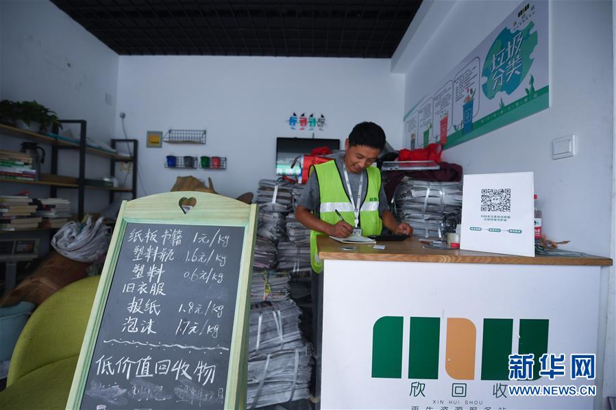 6月17日,在位于湖州市龙泉街道华丰社区华丰一区的废品回收连锁服务站,工作人员韩飞在记录当天回收的各类废品数量。 2020年初开始,浙江省湖州市龙泉街道开始打造街区内标准化废品回收“连锁店”。龙泉街道有10个社区8万多居民,针对以往废品回收价格混乱、人员无序等情况,街道联合专业再生资源回收企业,建设统一门店,统一回收价格和回收系统,同时对在社区“打游击”的个体废品回收人员进行专业培训,纳入管理体系。通过标准化废品回收“连锁店”的建设,龙泉街道80%以上的社区回收垃圾可以送到再生资源回收企业二次利用。 新华社记者 徐昱 摄