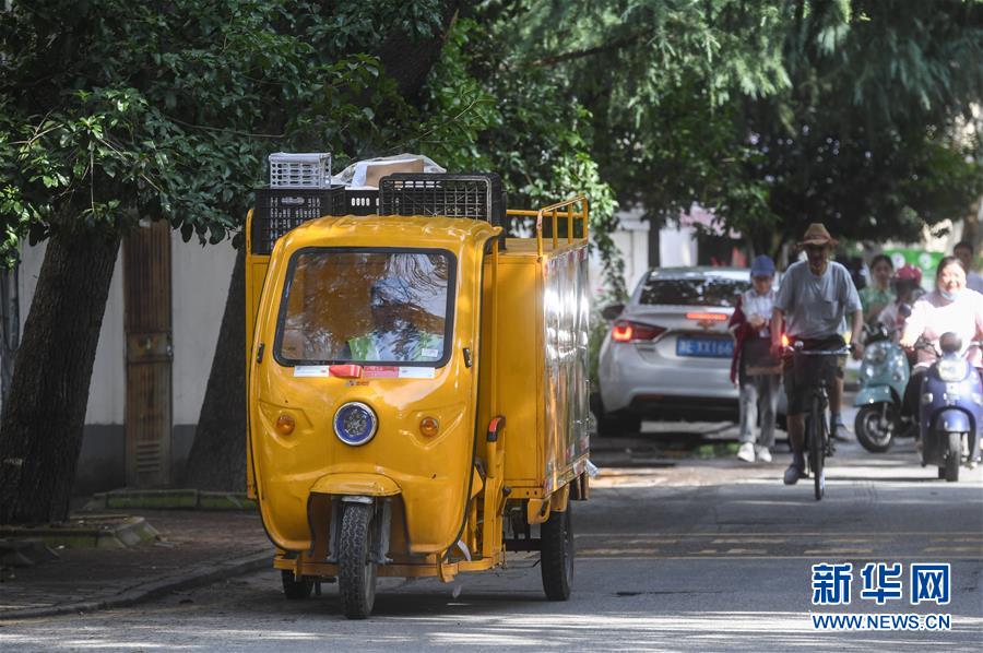 6月17日,湖州市龙泉街道废品回收连锁服务站统一标识的黄色回收车在社区内穿行,进行日常的废品回收。 2020年初开始,浙江省湖州市龙泉街道开始打造街区内标准化废品回收“连锁店”。龙泉街道有10个社区8万多居民,针对以往废品回收价格混乱、人员无序等情况,街道联合专业再生资源回收企业,建设统一门店,统一回收价格和回收系统,同时对在社区“打游击”的个体废品回收人员进行专业培训,纳入管理体系。通过标准化废品回收“连锁店”的建设,龙泉街道80%以上的社区回收垃圾可以送到再生资源回收企业二次利用。 新华社记者 徐昱 摄