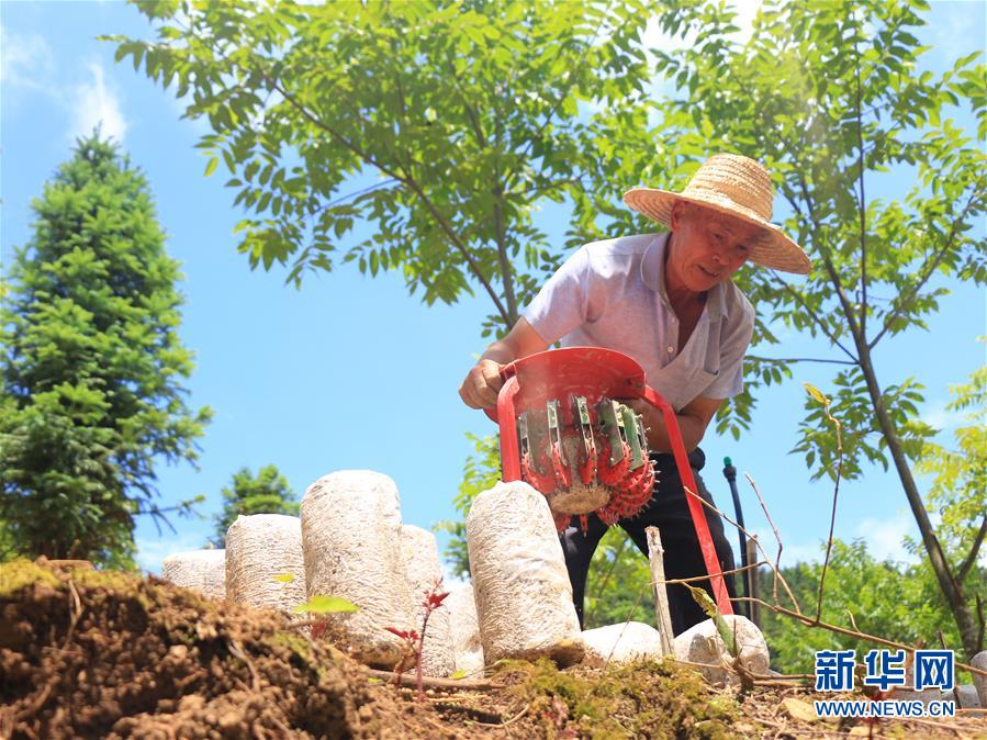 6月17日,在兴义市洒金街道林下菌药产业种植基地,农户在给木耳菌棒打孔。 贵州省黔西南布依族苗族自治州兴义市洒金街道因地制宜大力发展林下菌药产业经济,带动贫困群众就业增收。 新华社记者 郑明鸿 摄