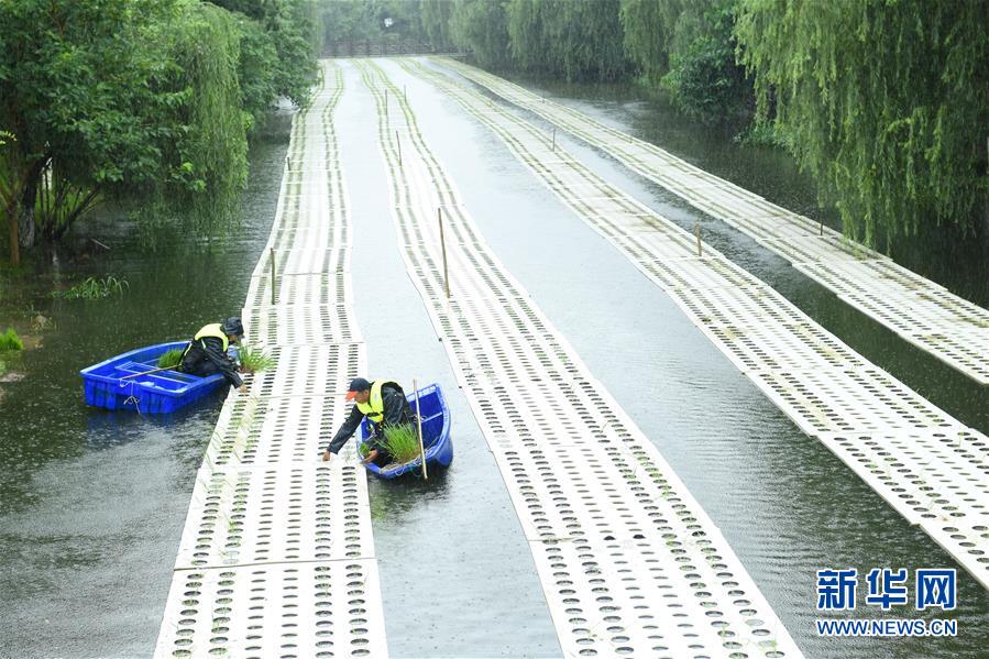 6月29日,工作人员在吴兴区湖东街道的“水上稻田”插秧。 今年以来,浙江湖州吴兴区湖东街道开始在辖区河道大规模推广“水上稻田”新型农业项目,利用浮岛进行特种水稻种植,既能净化水体,又能产出生态稻谷。“水上稻田”预计在11月实现收割。 新华社记者 翁忻旸 摄