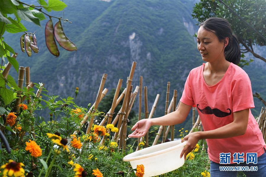 7月3日,26岁的下庄村村民龙云在自家院子里给花浇水。新华社记者 王全超 摄