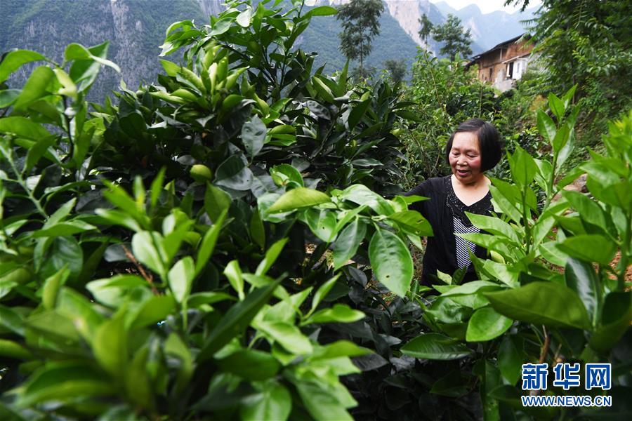 7月3日,63岁的下庄村村民刘崇英在查看柑橘的生长情况。 新华社记者 王全超 摄