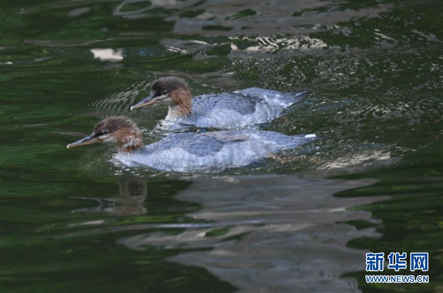 7月7日,两只中华秋沙鸭在长白山国家级自然保护区头道自然保护站水域戏水。