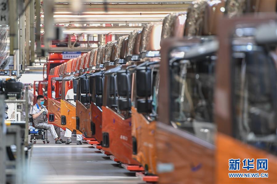在位于长春市的一汽解放总装车间,工人在装配车辆(6月19日摄)。