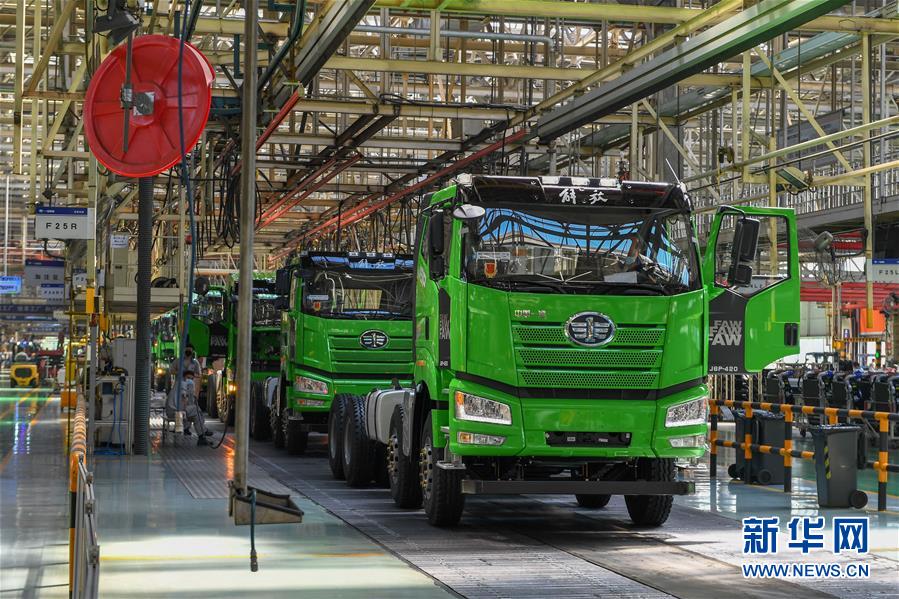 在位于长春市的一汽解放总装车间,工人在装配车辆(6月19日摄)。