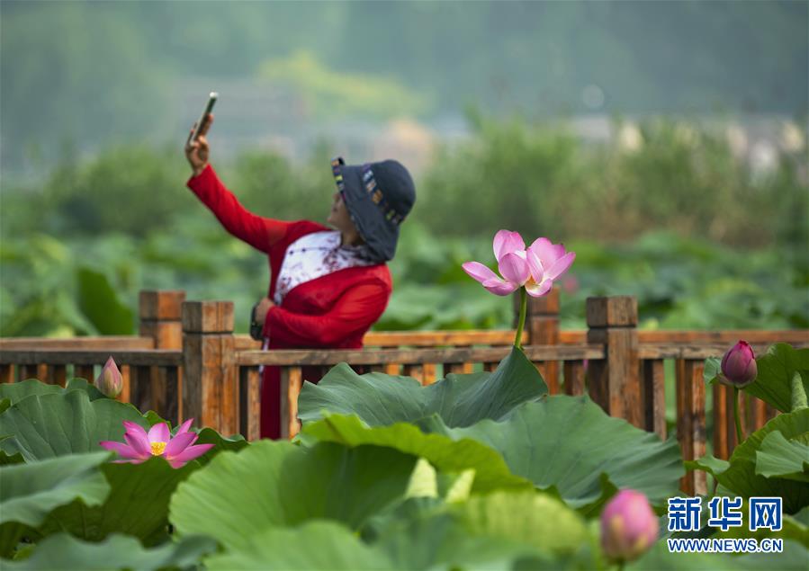 7月7日,游客在唐山市南湖公园内的观荷栈桥上拍照。 近日,河北省唐山市南湖公园内荷花竞相绽放,呈现出“接天莲叶无穷碧,映日荷花别样红”的美丽景象,吸引了众多游客前来观赏。 新华社记者 杨世尧 摄