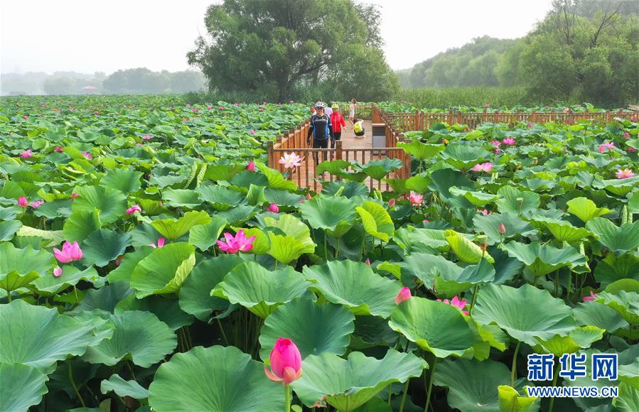 7月7日,游客在唐山市南湖公园欣赏盛开的荷花(无人机照片)。