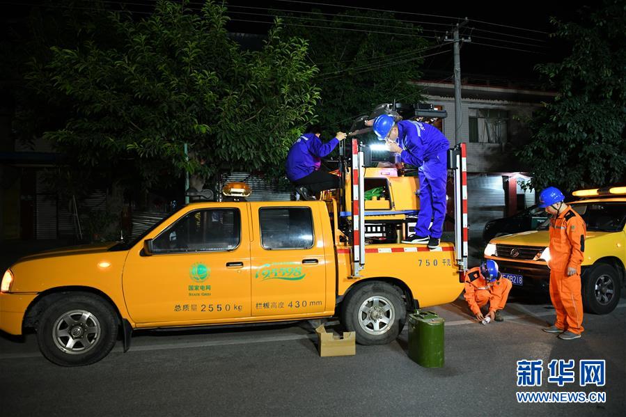 7月9日凌晨,在广汉市南丰镇元盛村,电力部门在调试设备提供应急照明。