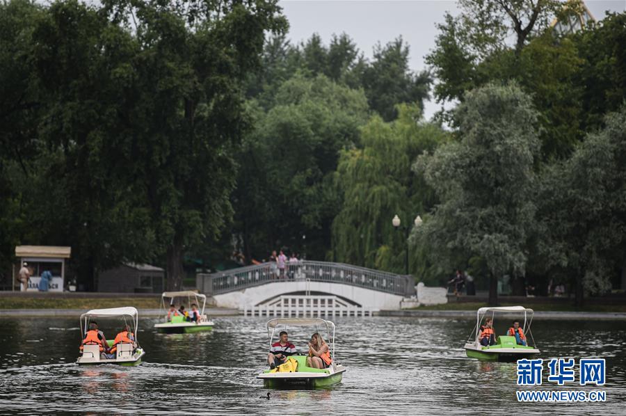 7月8日,在俄罗斯首都莫斯科,人们在公园内乘坐游船。