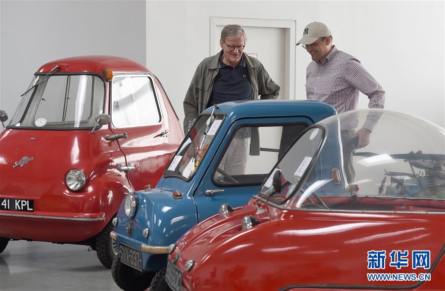 7月8日,两名男子在奥地利弗森多夫举行的“迷你”老爷车展上参观。新华社记者 郭晨 摄