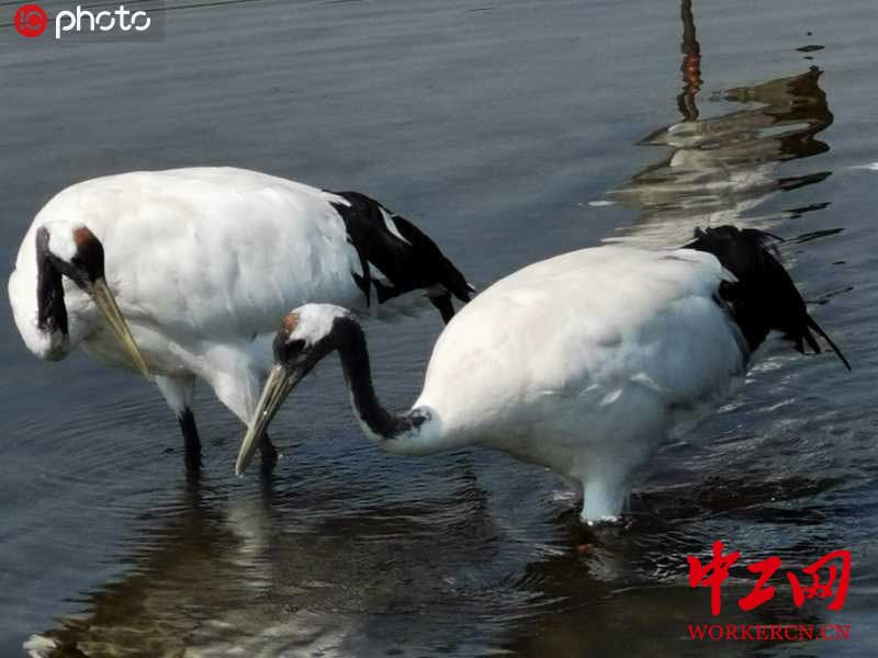 黑龙江扎龙国家级自然保护区丹顶鹤湖中嬉戏