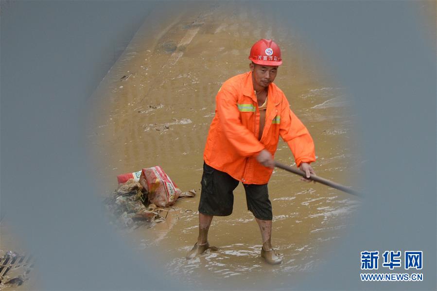7月8日,在湖南省吉首市,环卫工人在现场清淤。 当日,湖南省湘西土家族苗族自治州吉首市出现强降雨天气,部分道路积水形成内涝,环卫等部门对积水路段开展排水、清淤工作。 新华社发(陈振海 摄)