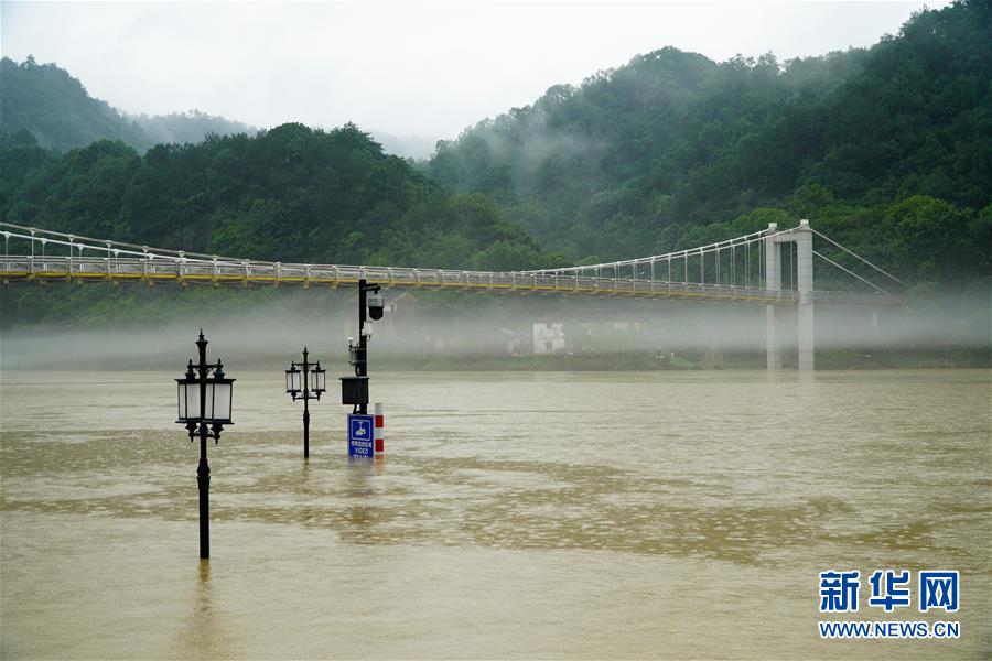 7月8日在桐庐县城东门码头拍摄的分水江。涨起的江水已将游步道淹没,只露出路灯。新华社记者 殷晓圣 摄