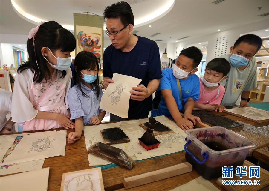 7月8日,山东省潍坊市潍城区城关街道十笏园社区的小朋友在了解木版年画的印制。 当日,山东省潍坊市潍城区城关街道十笏园社区开展了“暑假学‘非遗’”活动,组织社区内放暑假的孩子到十笏园文化街区现场体验了解潍坊风筝、木版年画、传统花灯等非遗项目的制作工艺过程,感受家乡传统民间文化的魅力,乐享假期。 新华社发(张驰 摄)
