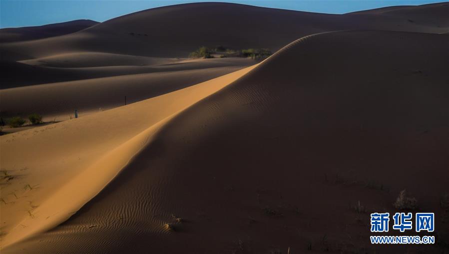 这是7月8日拍摄的腾格里沙漠风光。 位于内蒙古自治区阿拉善左旗西南部和甘肃省中部边境的腾格里沙漠是我国第四大沙漠,总面积约为4.3万平方公里。夏日傍晚,腾格里沙漠连绵的沙丘被日光勾勒出美丽的线条,美不胜收。 新华社记者 连振 摄