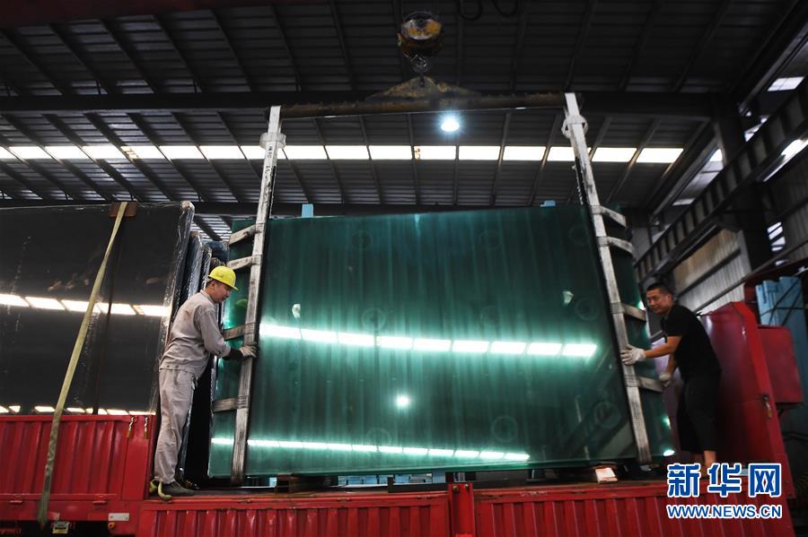 7月9日,重庆市渝琥玻璃有限公司工作人员在装运平板玻璃。