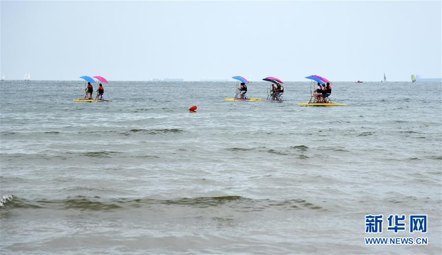 7月9日,游客在山东日照海上游玩。 时下正值暑期,山东海滨城市日照吸引不少游客前来消夏避暑。 新华社记者 王凯 摄
