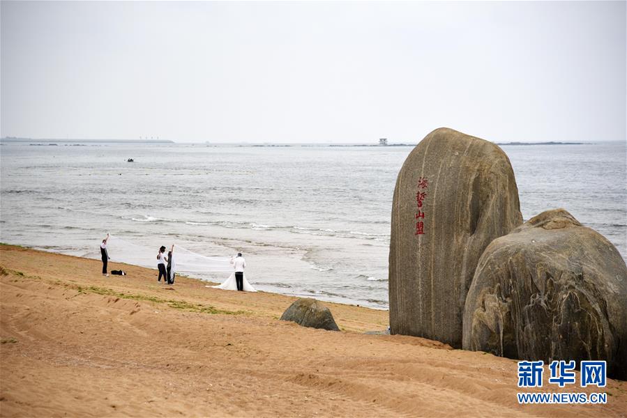 7月9日,游客在山东日照海边拍摄婚纱照。 时下正值暑期,山东海滨城市日照吸引不少游客前来消夏避暑。 新华社记者 王凯 摄