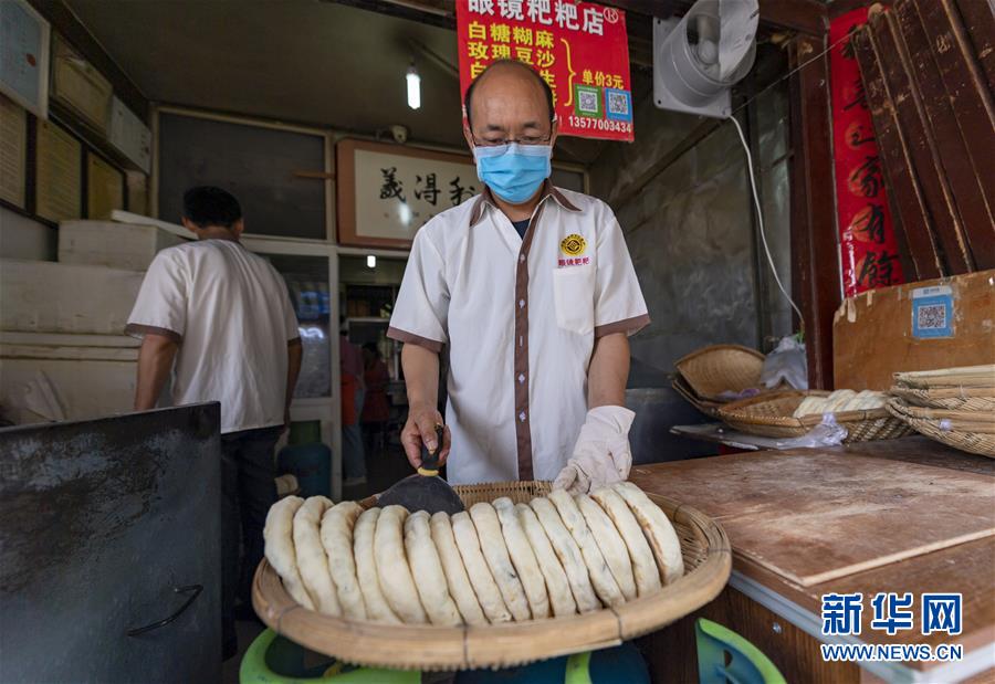 7月8日,“眼镜粑粑”店主杨武在摆放刚烤好的粑粑。