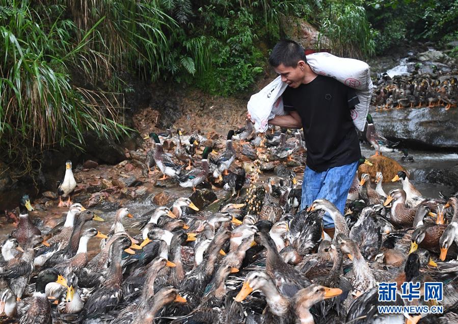 赵意富家住广西龙胜各族自治县龙胜镇山东村。2018年,一次上山拉木材时发生的意外,让他失去了左臂。出院后,他曾外出务工,但无法找到好的工作。今年,赵意富开始利用家乡良好的自然条件,在山谷中养殖鸭子,目前已经养了4批,销售收入近7万元。