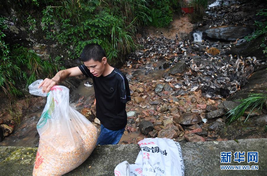 7月9日,在龙胜各族自治县龙胜镇山东村,赵意富准备扛起一袋玉米喂鸭子。 新华社记者 陆波岸 摄