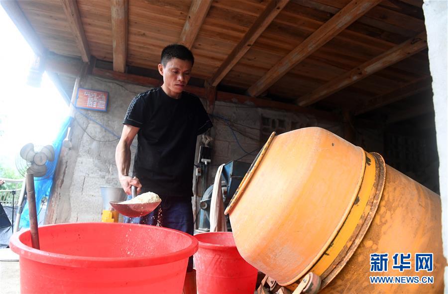 7月9日,在龙胜各族自治县龙胜镇山东村,赵意富在家中搅拌饲料准备喂鸭子。新华社记者 陆波岸 摄