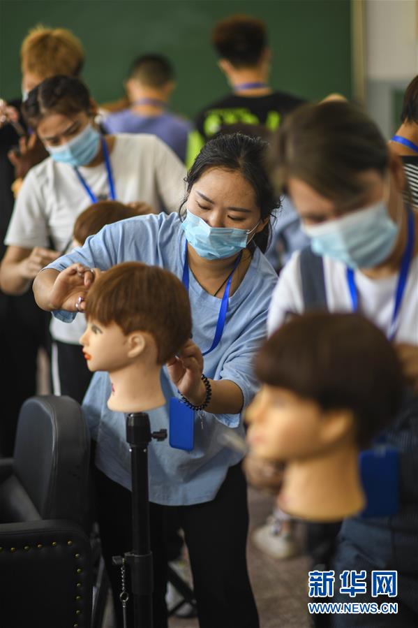 7月9日,在乌鲁木齐市沙依巴克区市民进修学校实用技能培训中心,学员学习美发技艺。新华社记者 赵戈 摄