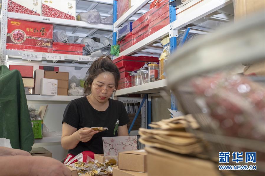 在位于新疆精河县城的工作室内,朱虹美按网友订单打包干果产品(7月11日摄)。 新华社记者 胡虎虎 摄