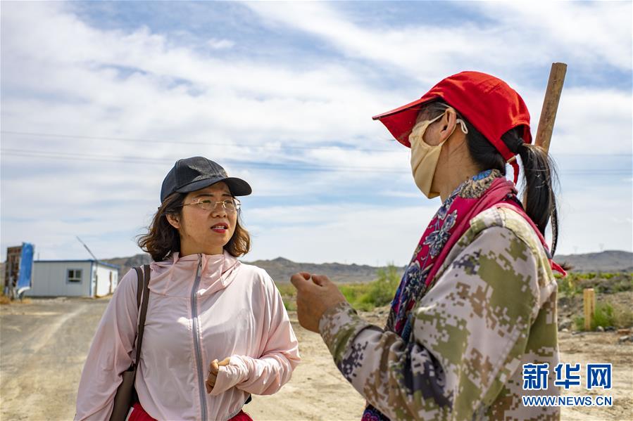 在新疆精河县城近郊的一处枸杞园,朱虹美(左)与一位杞农聊天(7月11日摄)。 新华社记者 胡虎虎 摄