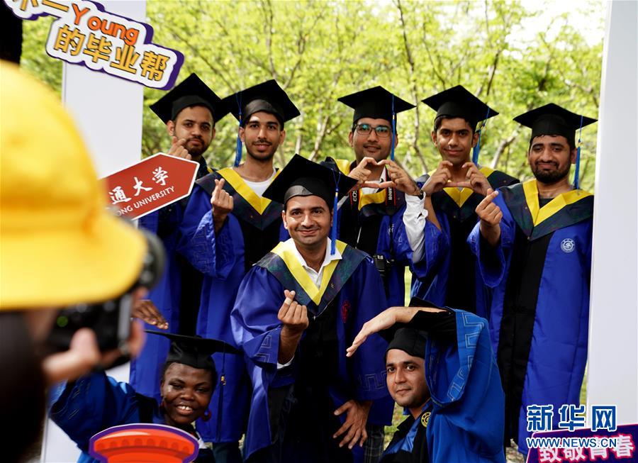 7月12日,上海交通大学留学生毕业生在校园里合影留念。 新华社记者 刘颖 摄