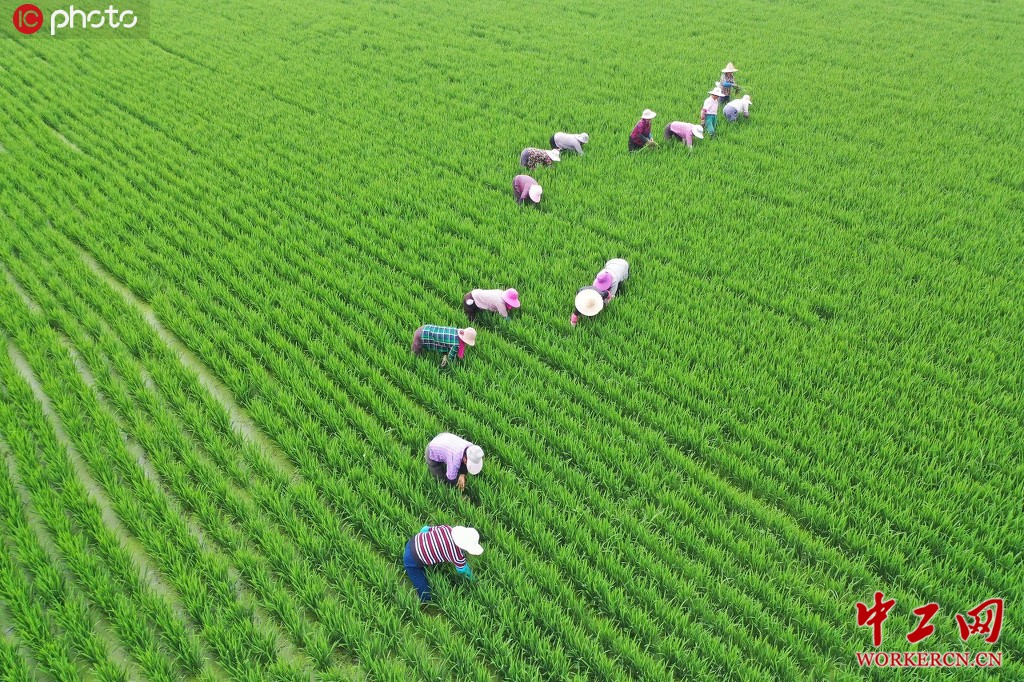 2020年7月13日,在江苏省淮安市洪泽区岔河镇,当地种植大户抓紧组织农民开展水稻田除草工作,为水稻健康高产打下基础。殷潮/IC photo