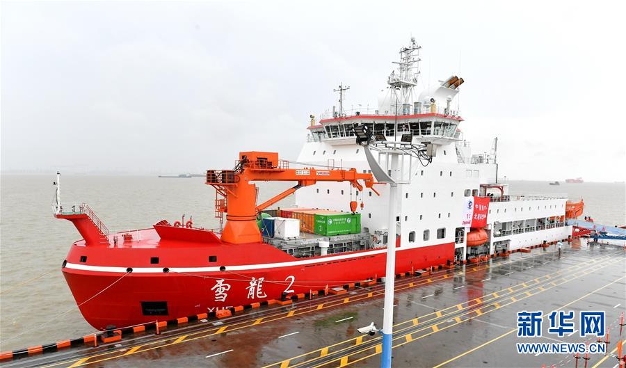 7月15日,“雪龙2”号停泊在位于上海的中国极地考察国内基地码头。 当日,由自然资源部组织的中国第11次北极科学考察队,乘坐“雪龙2”号极地科学考察船从上海出发,执行科学考察任务。这是“雪龙2”号顺利完成南极首航后,首次承担北极科学考察任务。 新华社发(中国极地研究中心供图)